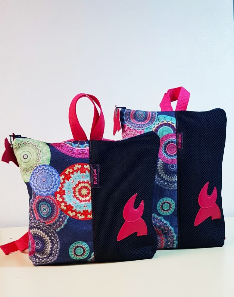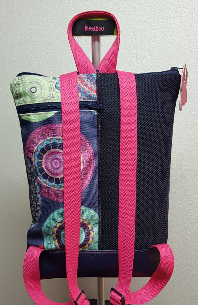 Combina dos tejidos resistentes, diferentes, uno con mandalas multicolor y el otro con predominio del Azul Navy.